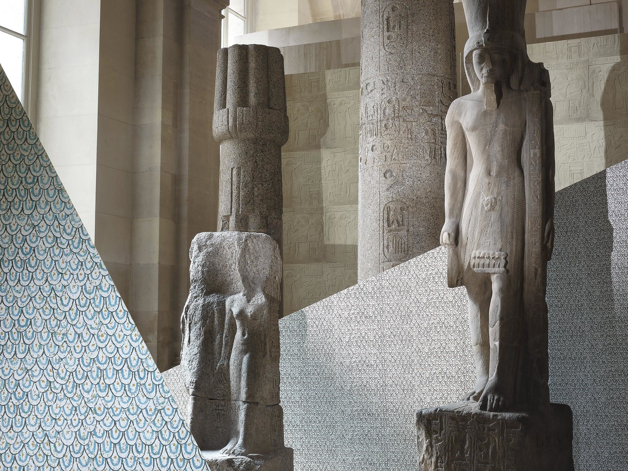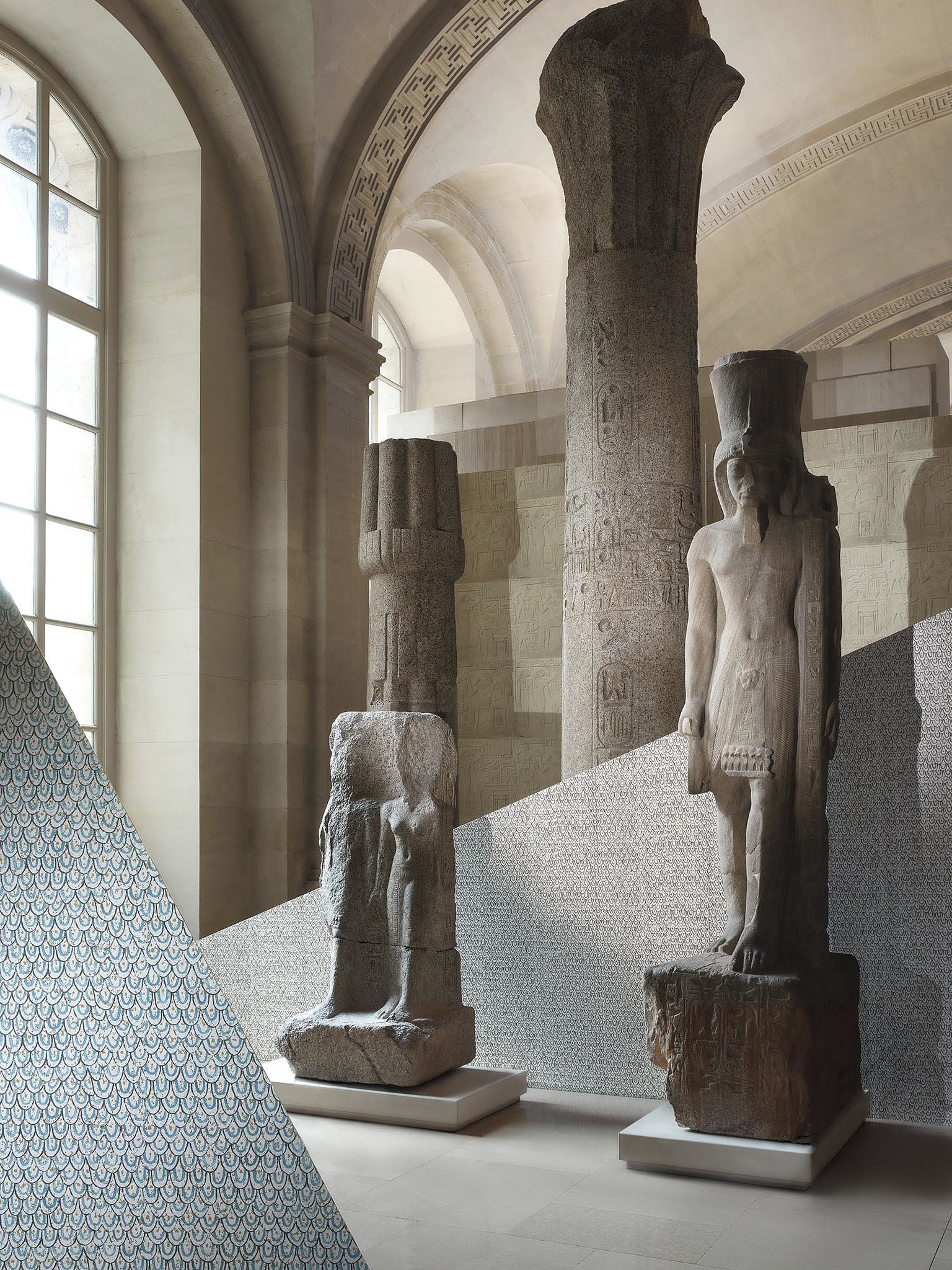 SHOUT behang is met de hand geschilderd patroon en doet denken aan de parelnetten gedragen door vrouwen in het oude Egypte. Deze decoratie is geïnspireerd op het standbeeld La Porteuse d'auge dat bewaard werd in de afdeling Egyptische Oudheden van het Louvre. In brede breedte bedrukt op matte vliesstof.