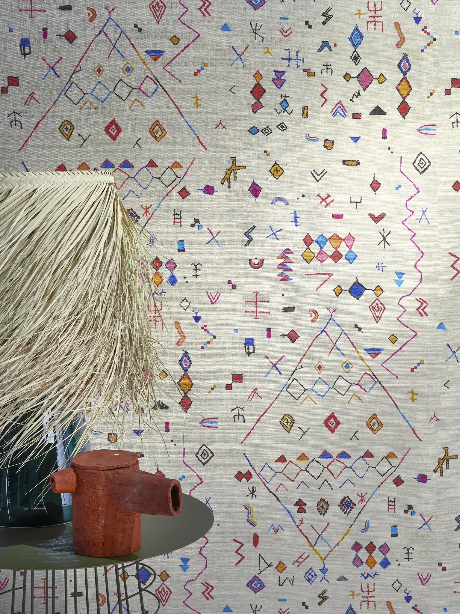 Touareg is een behang dat gecreëerd is door kunstenares Hala Salem. Deze muurbekleding van Pierre Frey uit de Les Dessins 6 collectie heeft een Noord-Afrikaans patroon, vol inheemse vormen en figuren. Een grafisch behang dat perfect is voor een exotisch, trendy en sfeervol interieur.