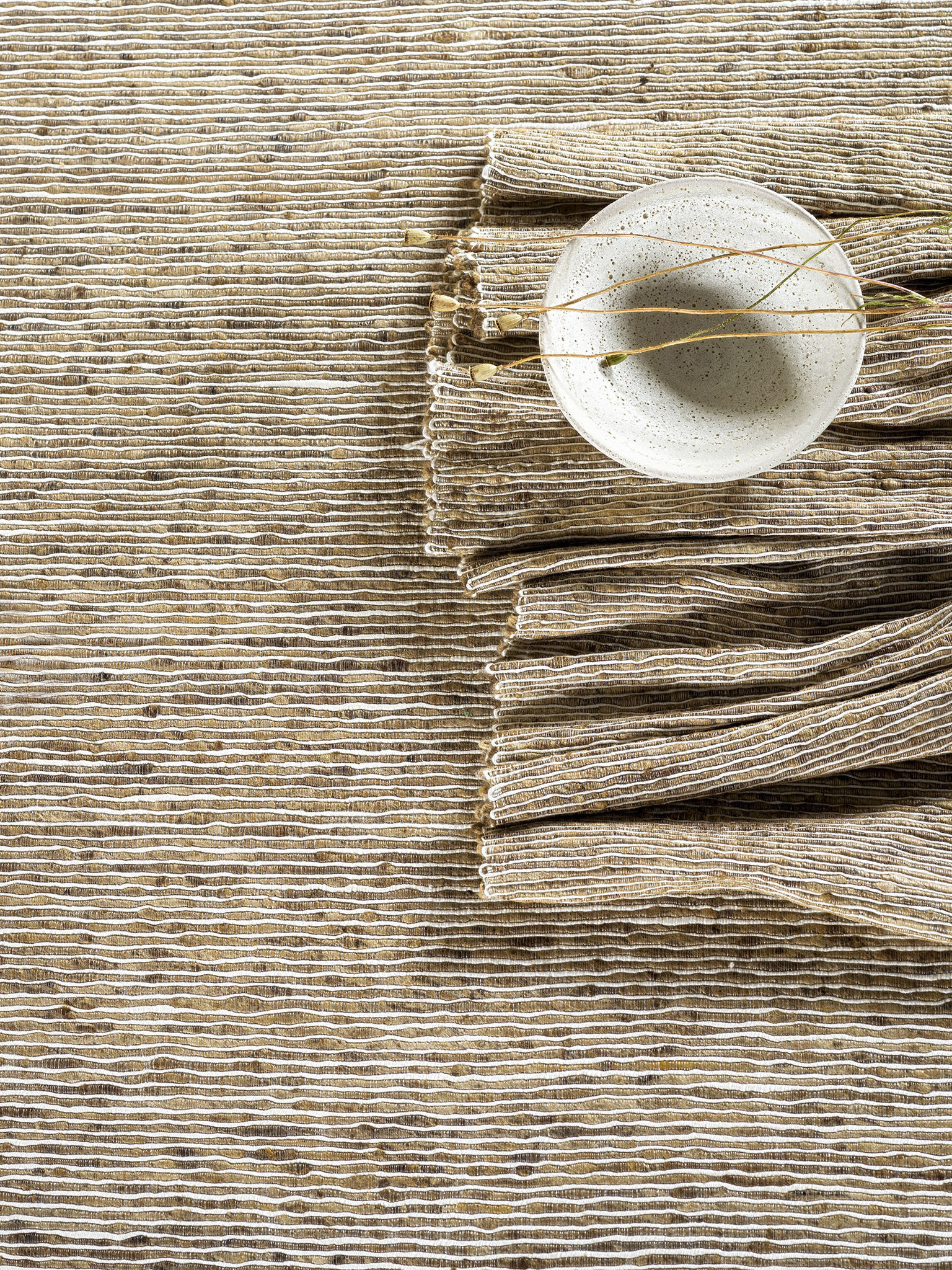 Dit rustieke maar verfijnde zijdeweefsel, gelamineerd op een brede non-woven, zorgt voor een prachtig horizontaal effect op de muur.