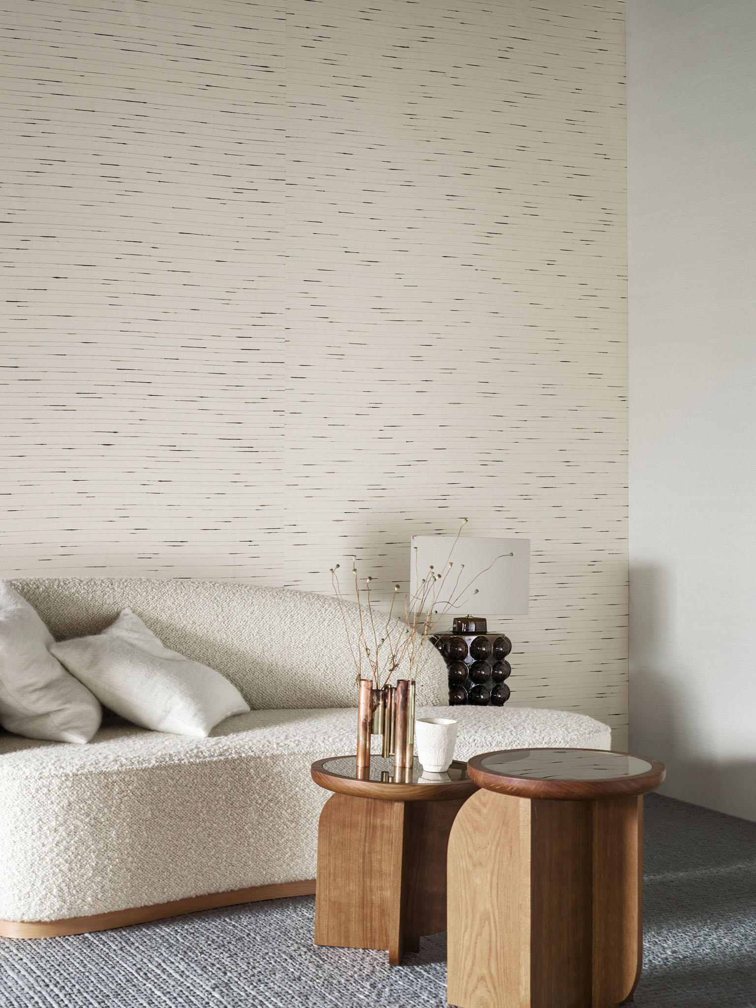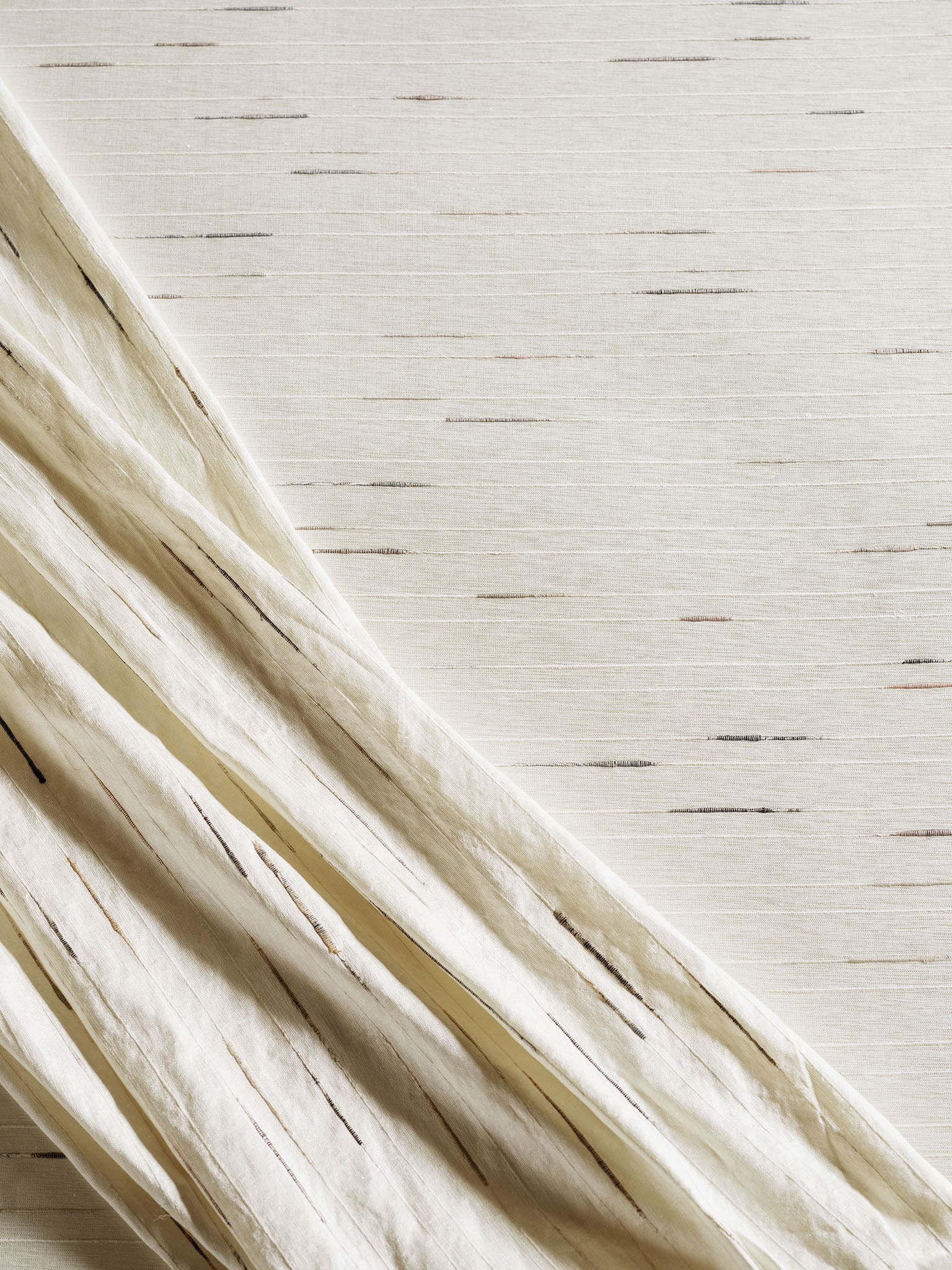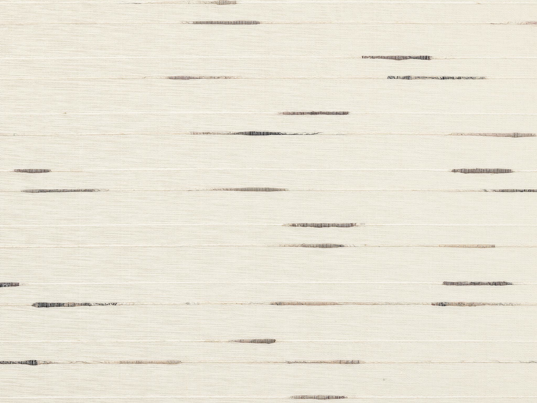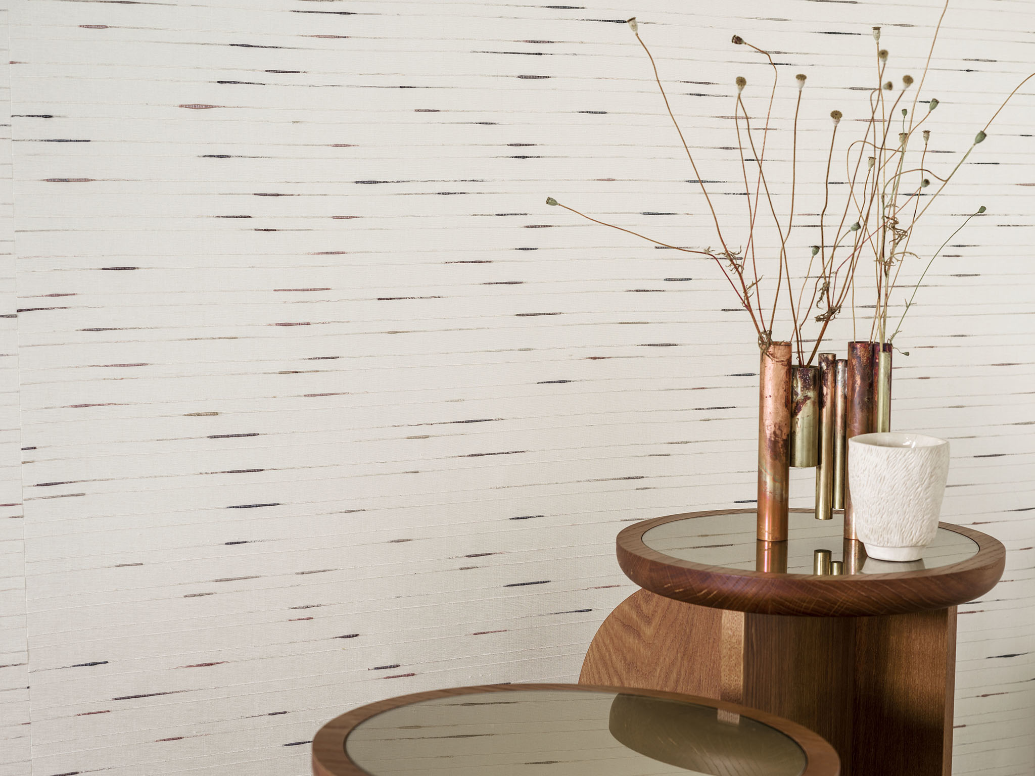 Geweven zijde en katoen gelamineerd op een brede non-woven waarvan de onregelmatigheid van de draden een mooi horizontaal, grafisch en verfijnd effect geeft.