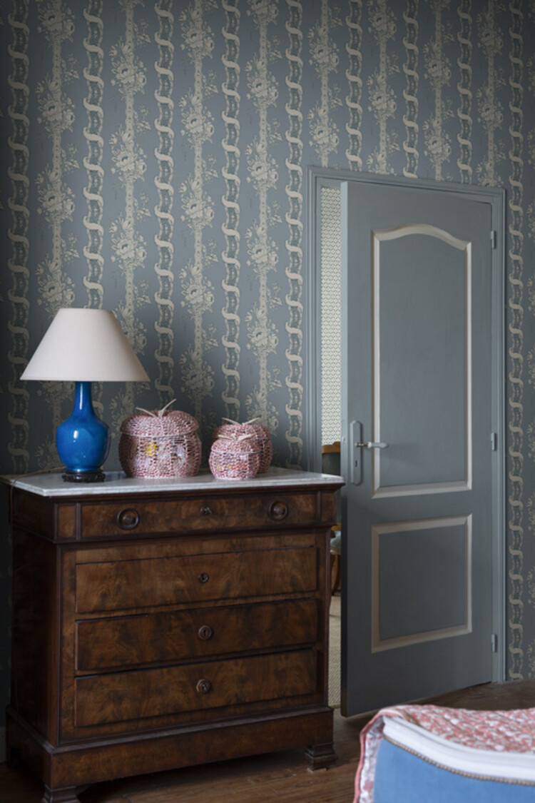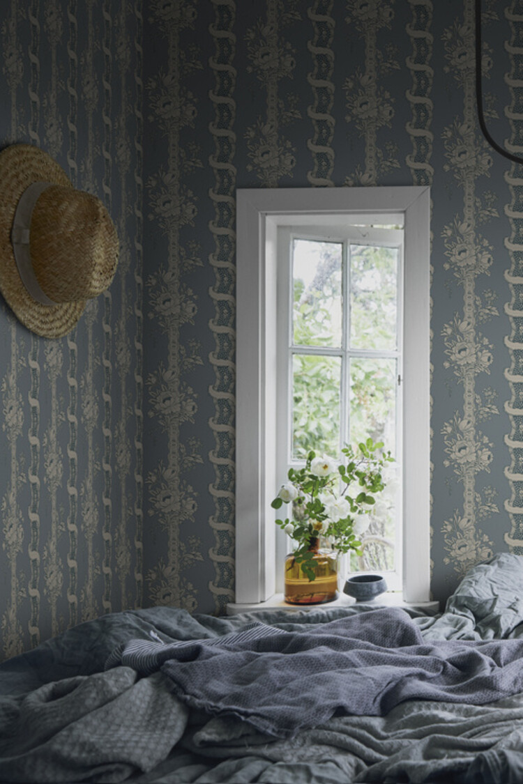 Alexandra is een behang geïnspireerd op handgeschilderde Domino uit Frankrijk, daterend uit het begin van de 19e eeuw. Deze muurbekleding van Sandberg, uit de collectie Le Village, toont verticaal bloeiende strepen en opwaartse wervelende linten patroon die zorgen voor een gevoel van hoogte in elke ruimte. Een vrouwelijk behang dat perfect is voor een charmant, klassiek en romantisch interieur.