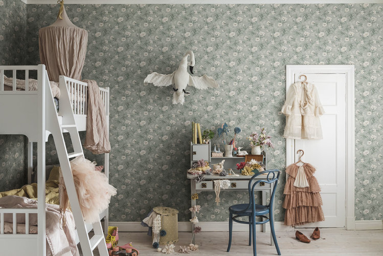 Een charmant behang dat haar naam draagt. Een behang dat doet denken aan een zomerweide, met een tuin en met de hand geplukte boeketten bloemen, het vangt het eindeloze verlangen naar de zomer. Het oppervlak van dit behang is bedrukt in vier verschillende kleurcombinaties in verschillende tinten.
