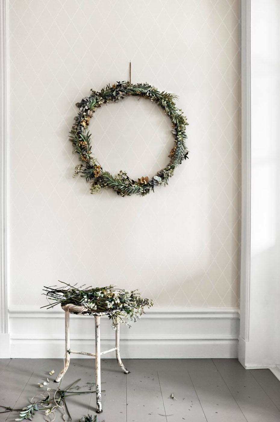 Gabriel is een mooi behang met elegante ruit en gouden stippen, Gabriel past goed bij ons gestreepte Gustav-patroon en creërt prachtige mooie muren in een eetkamer of woonkamer. Design: Karolina Kroon