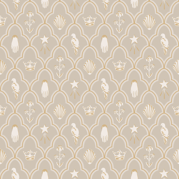 Turtledove barn is een behang vol symbolische verwijzingen. Deze muurbekleding van Sandberg, uit de collectie Le Village, toont onder andere een edelweiss, een hand, een kroon en een duif. Een behang met een klassiek patroon dat perfect is voor een stijlvol en klassiek interieur.