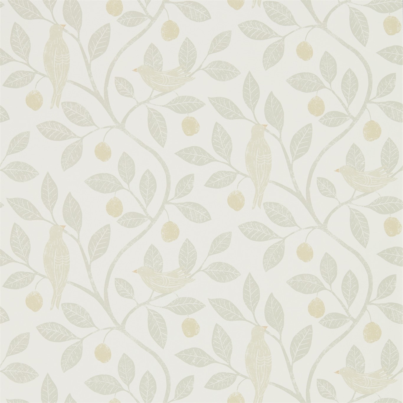 Gestileerde vogels zitten op gewelfde slepende takken op dit brede behang, geproduceerd in subtiele kleuren en verkrijgbaar als een stof met dezelfde naam. Gebruik om een achtergrond met een patroon toe te voegen aan meubels.