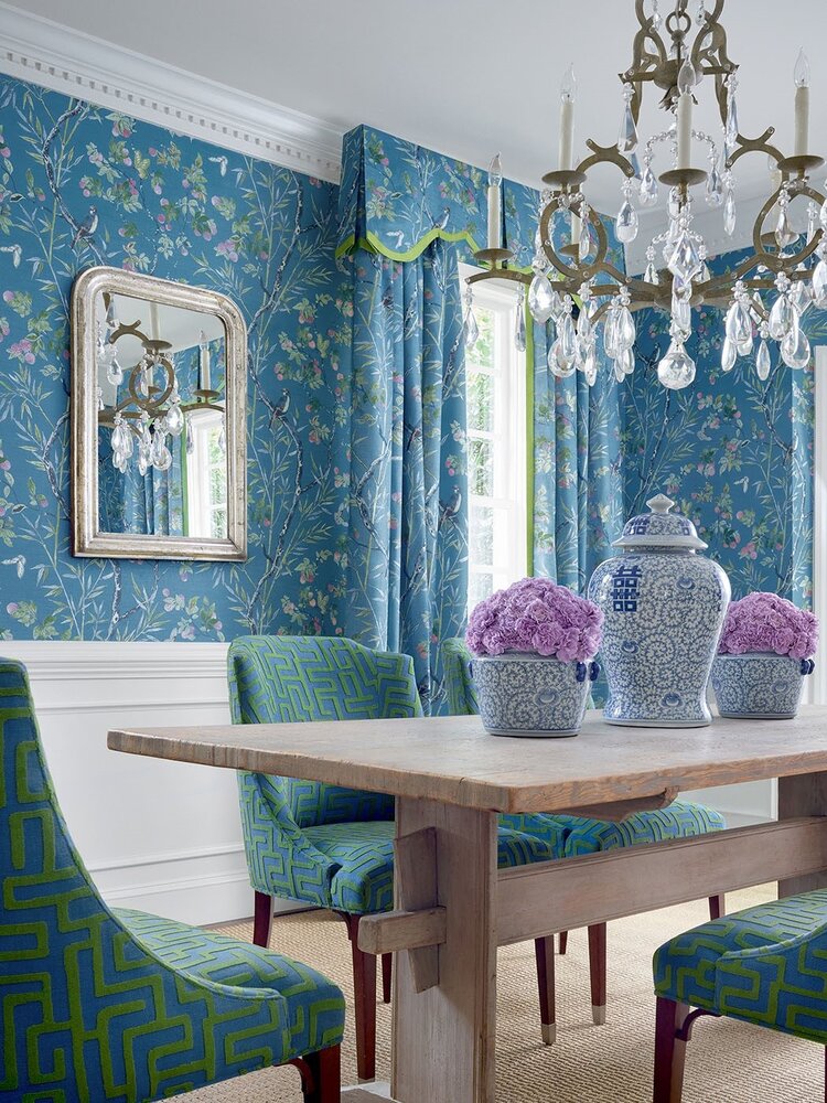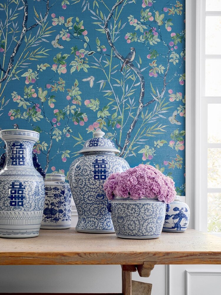 De luxe behangcollectie van het Amerikaanse merk Thibaut bevat zowel traditionele en klassieke patronen als tropische en geometrische prints.