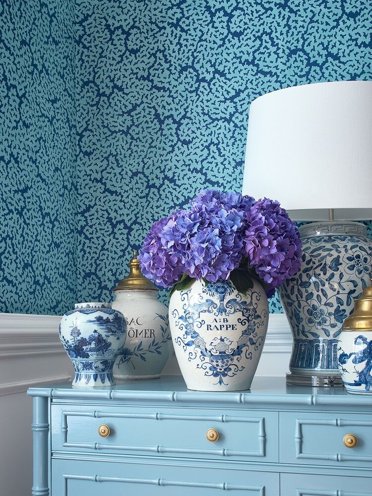 De luxe behangcollectie van het Amerikaanse merk Thibaut bevat zowel traditionele en klassieke patronen als tropische en geometrische prints.