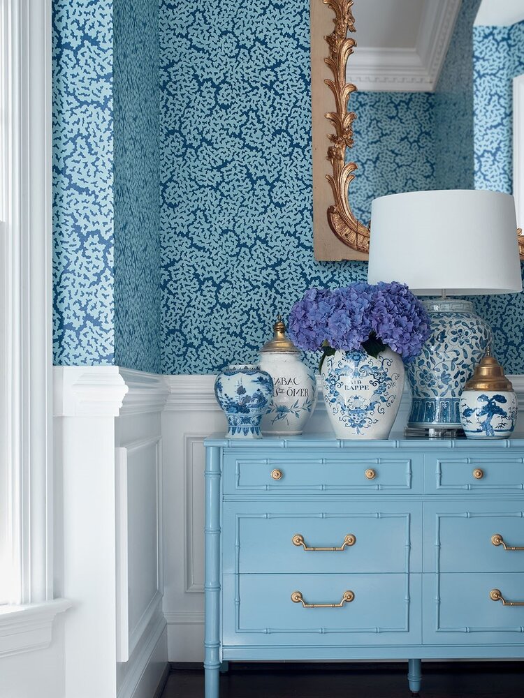 De luxe behangcollectie van het Amerikaanse merk Thibaut bevat zowel traditionele en klassieke patronen als tropische en geometrische prints.