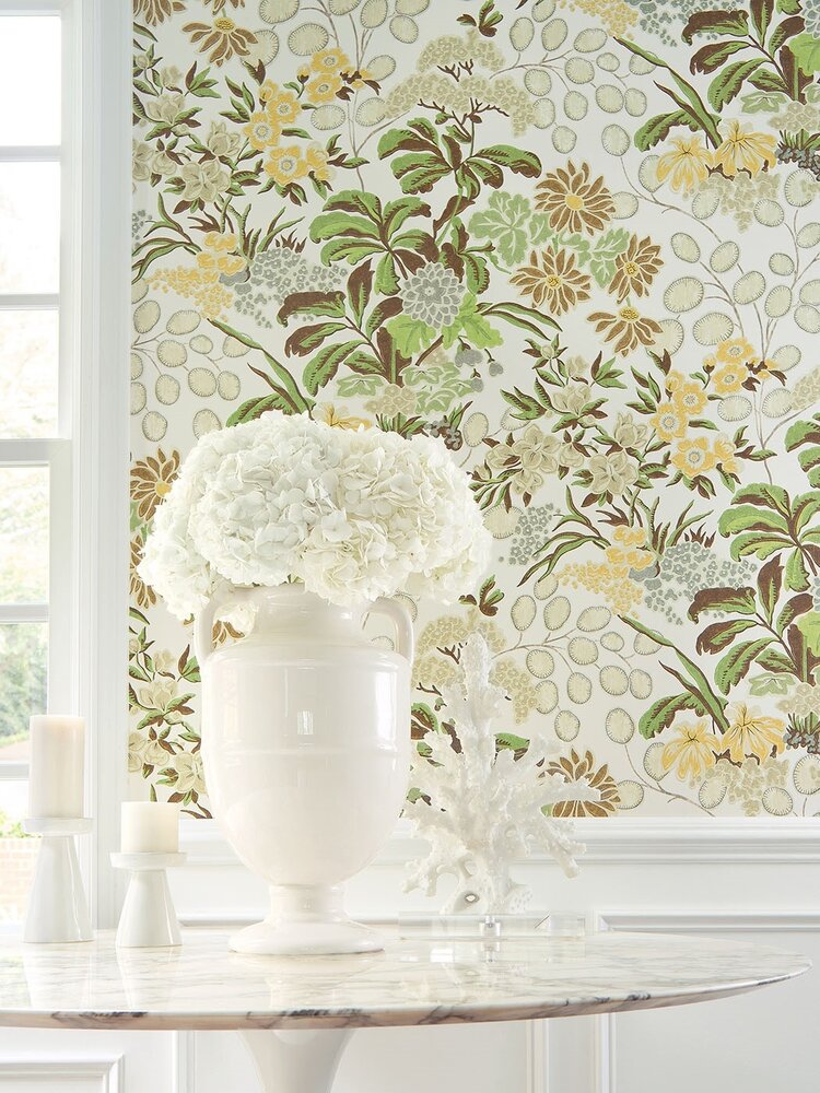 De luxe behangcollectie van het Amerikaanse merk Thibaut bevat zowel traditionele en klassieke patronen als tropische en geometrische prints.
