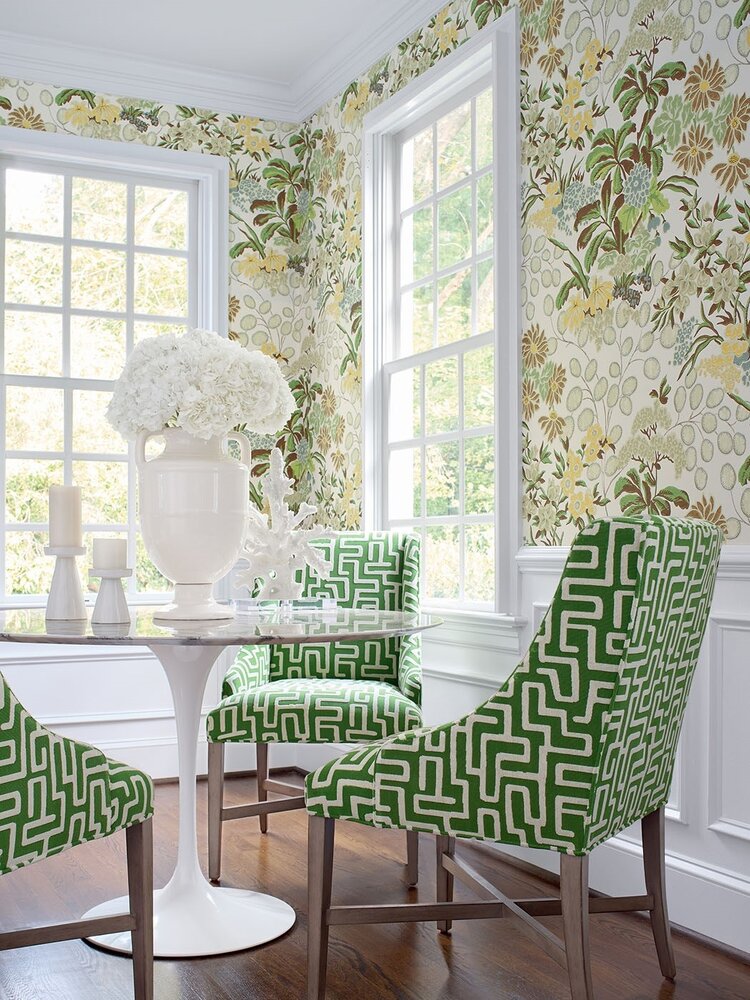 De luxe behangcollectie van het Amerikaanse merk Thibaut bevat zowel traditionele en klassieke patronen als tropische en geometrische prints.