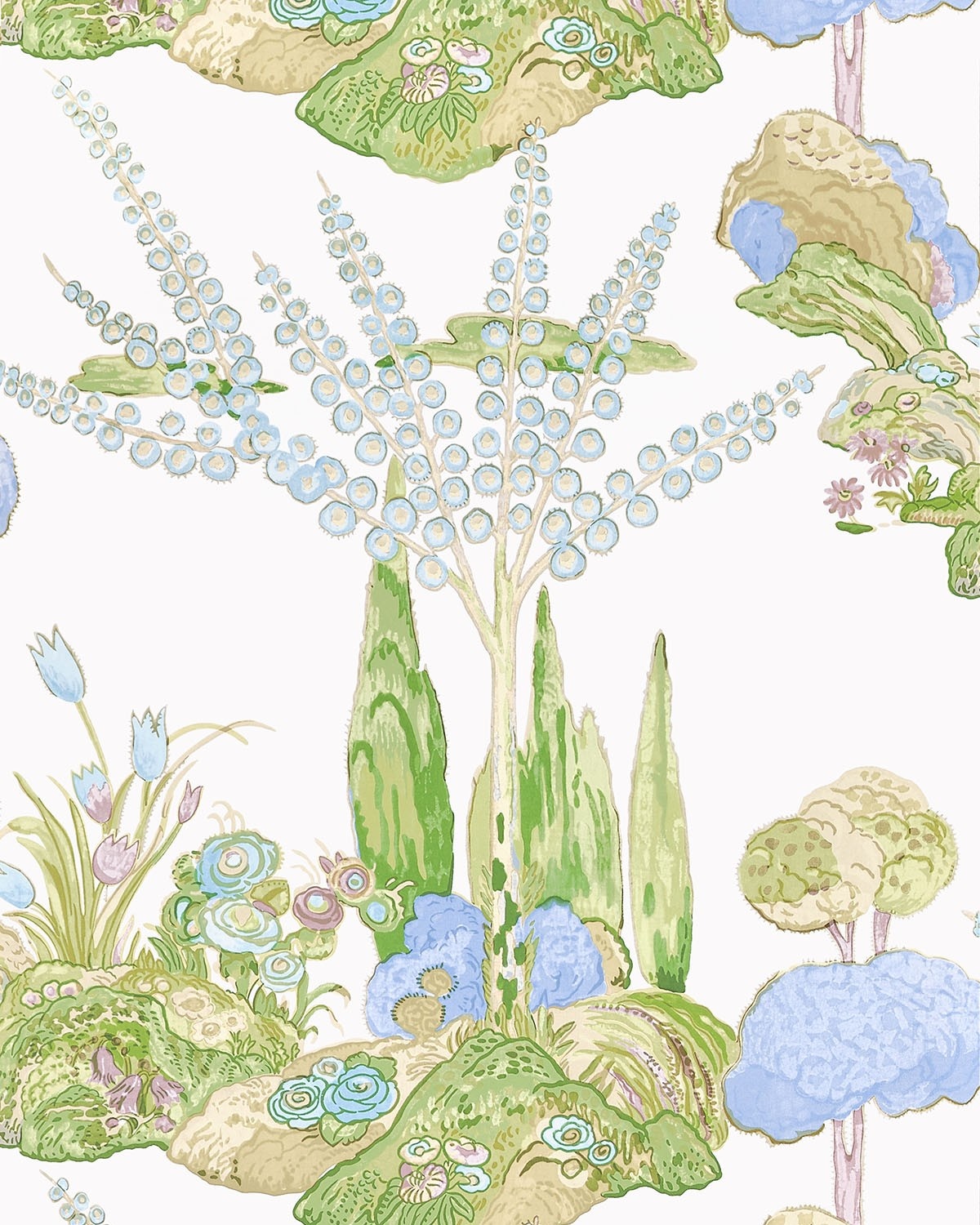 De luxe behangcollectie van het Amerikaanse merk Thibaut bevat zowel traditionele en klassieke patronen als tropische en geometrische prints.