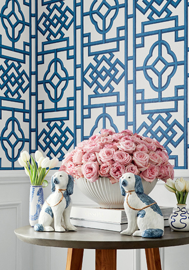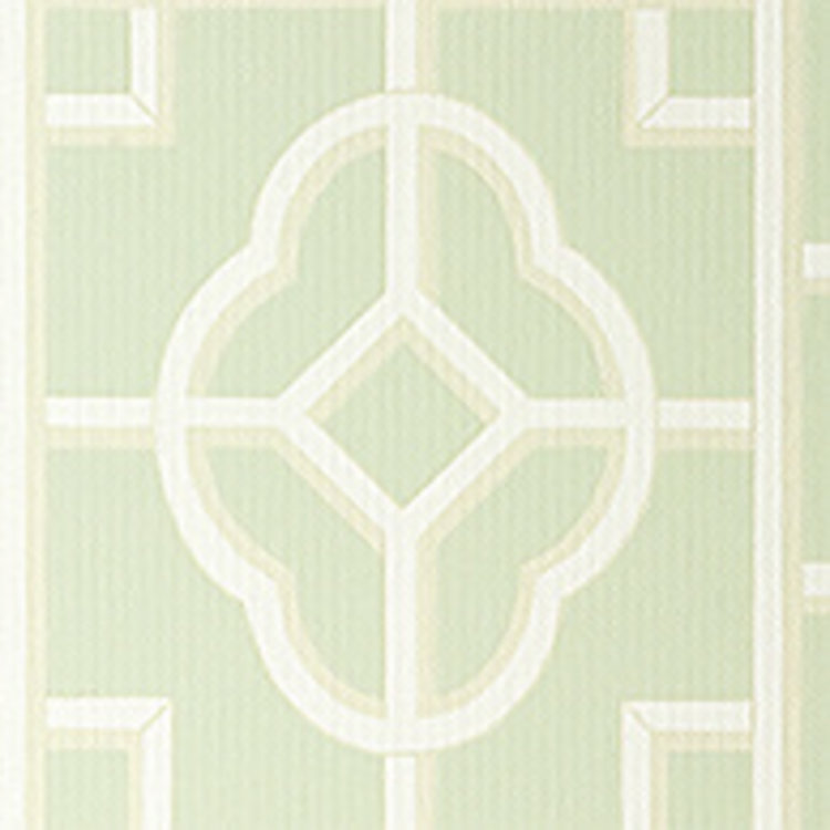 Het Gateway-behang van Thibaut heeft een grootschalig geometrisch patroon dat doet denken aan een Aziatisch rasterwerk.