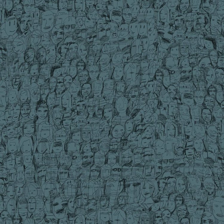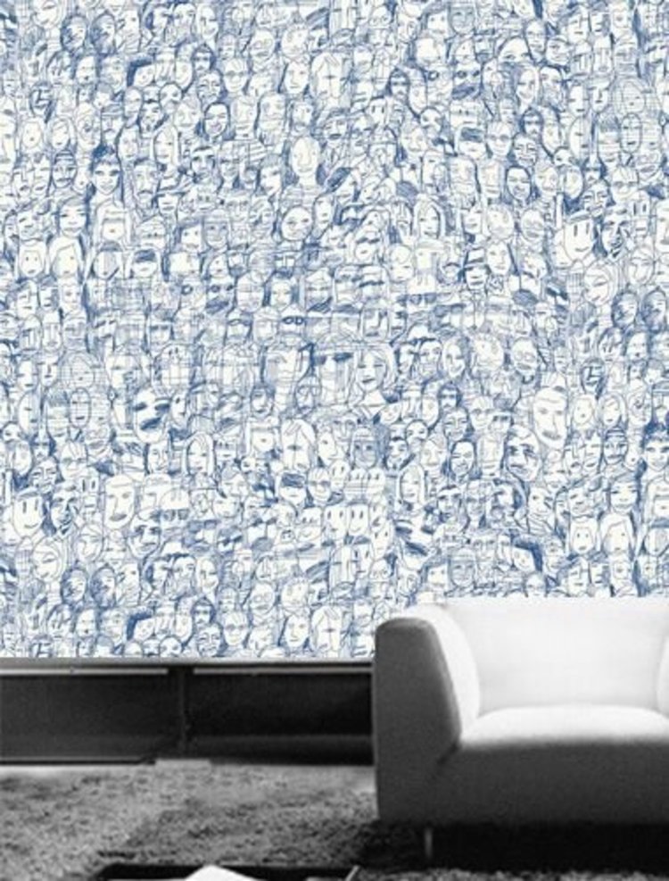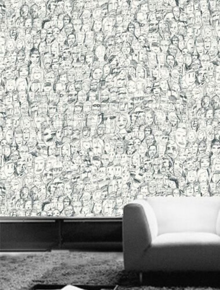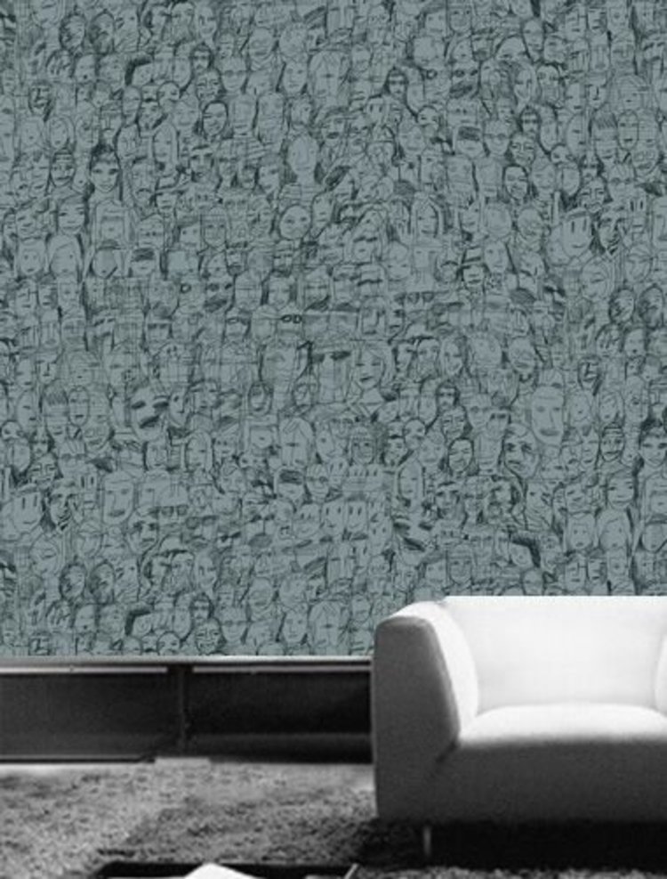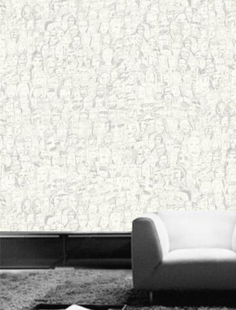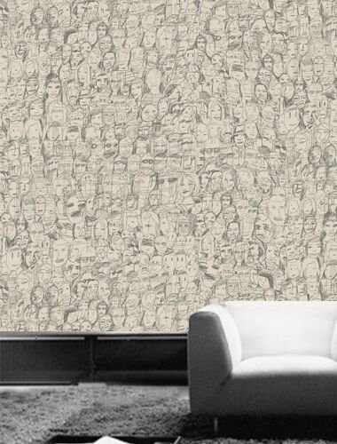 Behang uit de collectie 9 Selvas de Mariscal van Tres Tintas. Patroon Mil Caras (19954) met gezichten in kleur donkergrijs. Dit behang, met rapport, is afwasbaar en kan rechtstreeks op de muur geplakt worden.