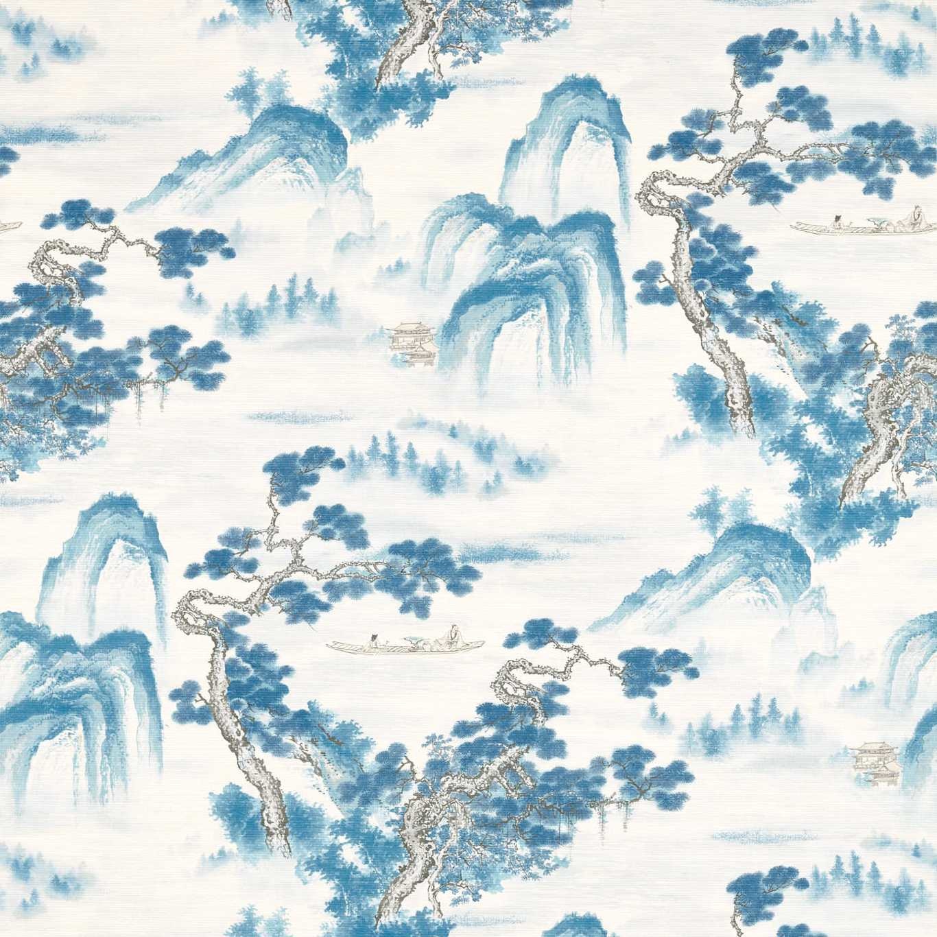 Floating Mountains behang. Gebaseerd op een archiefdocument en geïnspireerd door de tekeningen op een oude hangende boekrol, verbeelden rollende watervallen en torenhoge bergen een klassiek Chinees tafereel. Met de hand getekend met pen en waterverf, is Floating Mountains gedrukt op een papieren ondergrond van textiel, waardoor de authenticiteit en herkomst wordt verhoogd. De Mineral colourway, met zijn etherische look, is gedrukt op een mica ondergrond.