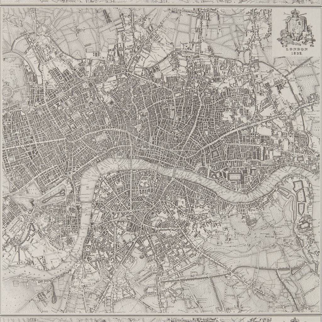 Dit behang op grote schaal is geïnspireerd op een stoffen sjaal uit het archief van Zoffany, waarop een kaart van Londen uit 1832 staat afgebeeld. Dit papier is digitaal gedrukt als wandbekleding met een brede breedte (137 cm) die wordt verkocht door de herhaling (132,2 cm) en veelvouden daarvan.