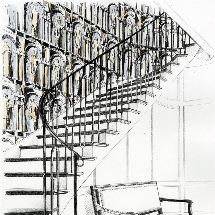 De oorsprong ligt vermoedelijk tussen de verouderde façade van Somersets Montacute House en dit fantastische ontwerp heeft een nette rij klassieke beelden in nissen met arcaden. Het originele markeringsdetail vertegenwoordigt een moment in de tijd en legt het handschrift van de kunstenaar prachtig vast.